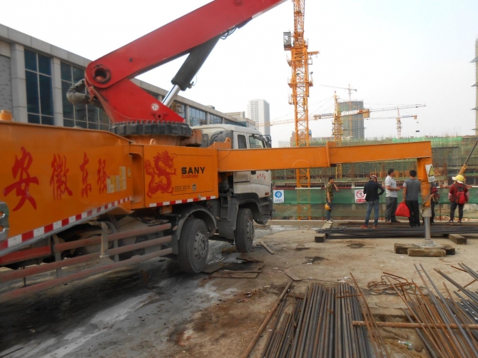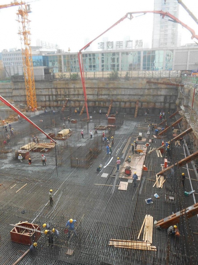 寶利豐廣場項目樓位于徽州大道與靶場路交口,其中1#樓采用樁筏基礎,其中核心筒區域筏板厚度為7-8m,其他區域厚度為3.2m,混凝土強度等級為C40P8,一次性連續澆筑。施工現場布置56m汽車泵一臺,46m汽車泵兩臺,地泵一臺,截止2015年09月27日用時約40小時,8600立方混凝土全部澆筑完畢。